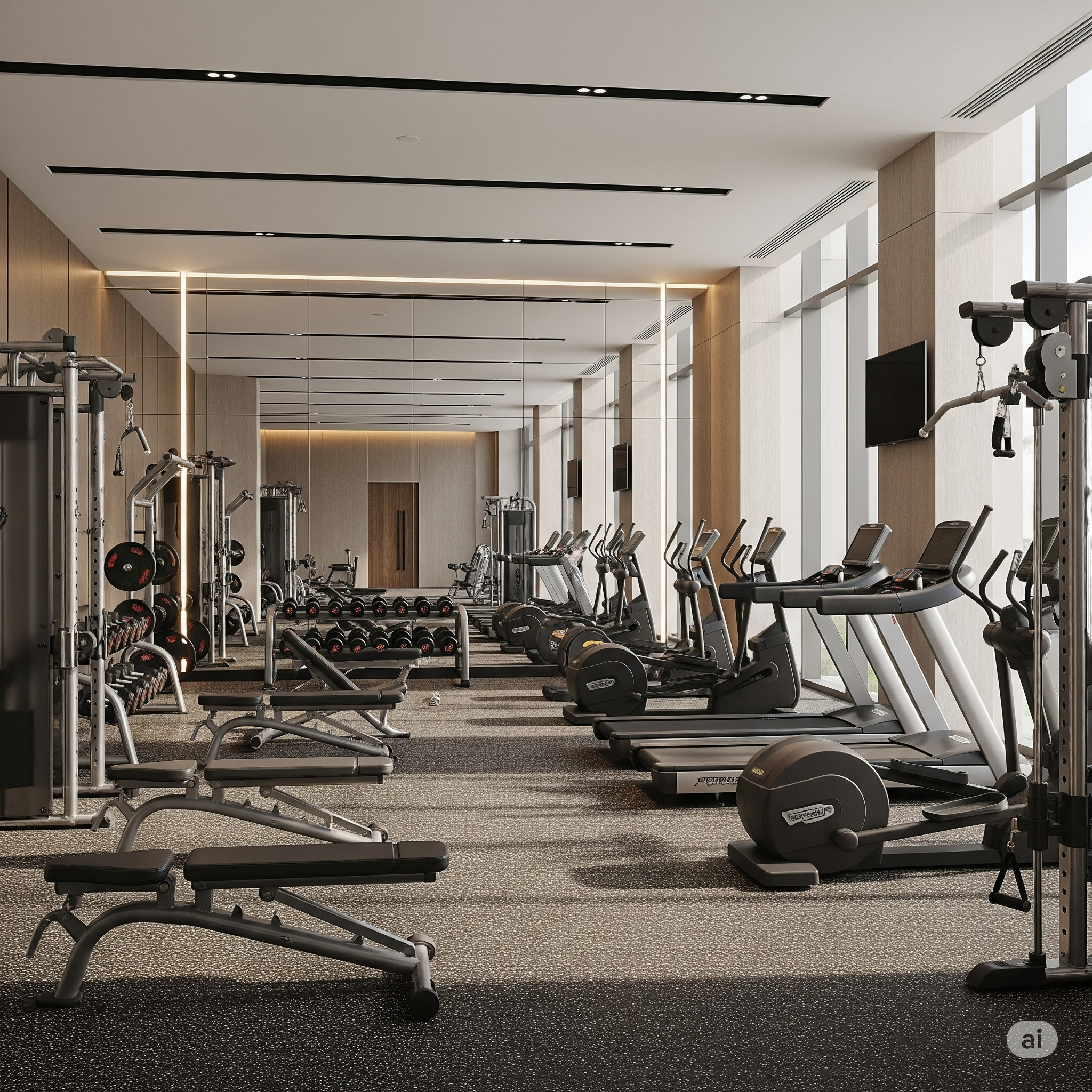 A state-of-the-art fitness center designed for apartment residents, featuring premium cardio and strength training equipment in a modern, inviting space that motivates residents to stay active.